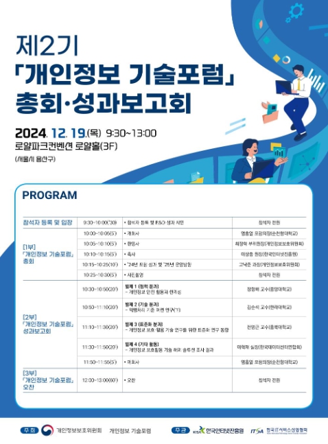 [뉴스서울] 개인정보 기술개발 활성화 및 산업 생태계 기반 구축을 위한 제2기 '개인정보 기술포럼'총회·성과보고회가 12월 19일 로얄파크컨벤션에서 열렸다. 이 자리에는 최장혁 개인정보보호위원회 부위원장을 비롯해 이상중 한국인터넷진흥원장(KISA) 등 관계기관 주요 인사가 참석했다.