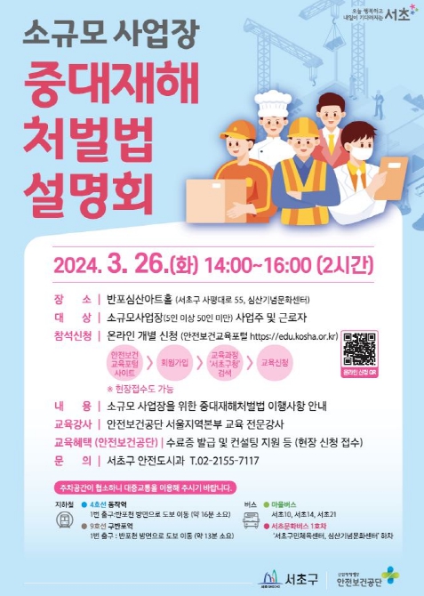 [뉴스서울] 서울 서초구가 26일 관내 5인이상 50인미만 소규모 사업장을 대상으로 반포심산아트홀에서 중대재해처벌법 설명회를 개최한다.