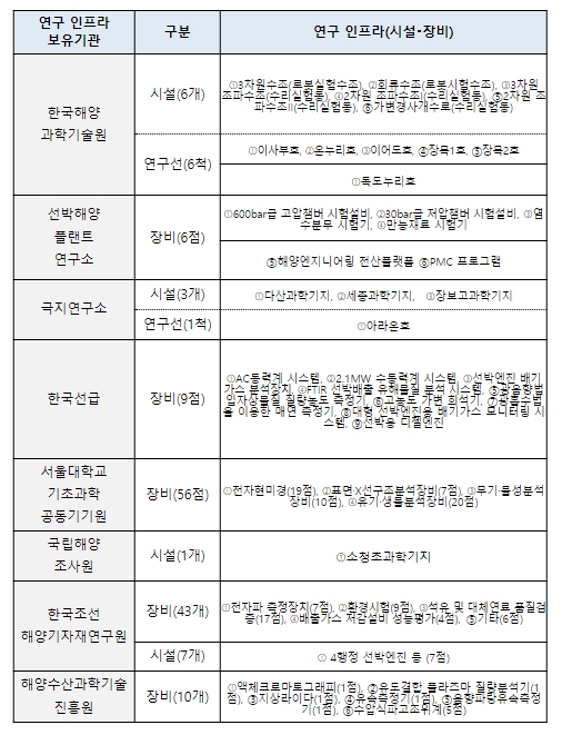 연구선, 과학기지 등 해양수산 연구인프라는 극한지나 심해저 등 열악한 해양현장에서의 시료 채취, 데이터 확보 등을 위한 핵심시설이다. 그러나, 각 기관에서 개별적으로 구축·운영함에 따라 외부 연구자가 인프라를 활용하는 것에 한계가 있었다. 이에 해양수산부는 2021년부터 인프라 개방 확대, 신청 창구 일원화, 사용료 지원 등의 연구인프라 공동활용 체계를 마련했고, 그 결과 현재까지 총 148개의 연구인프라가 개방되어 100여 건의 공동활용 연구과제를 지원했다.