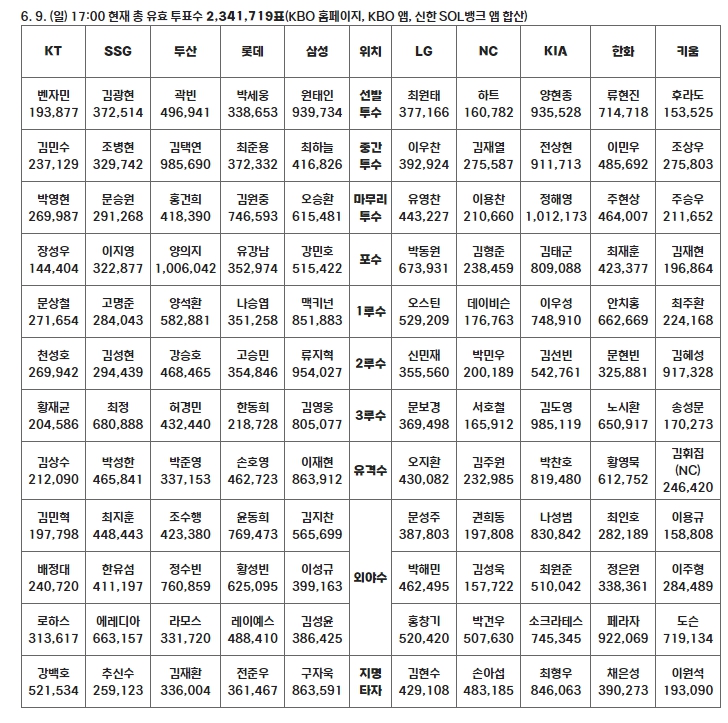▲ 2024 신한 SOL뱅크 KBO 올스타 ‘베스트12’ 팬 투표 2차 중간 집계 |