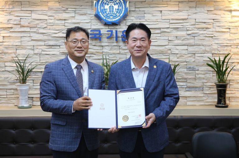 ▲ 5월 8일 국기원 귀빈실에서 열린 신임 국기원 태권도연구소 소장 위촉식에서 이동섭 원장(오른쪽)이 이충영 소장(왼쪽)에게 위촉장을 수여한 뒤 기념촬영을 하고 있다. |