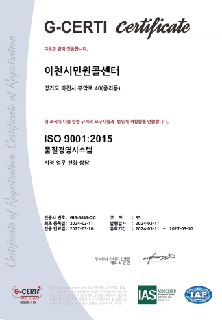 | ▲ 이천시 민원콜센터, 국제품질인증 ISO 9001 인증 획득 |