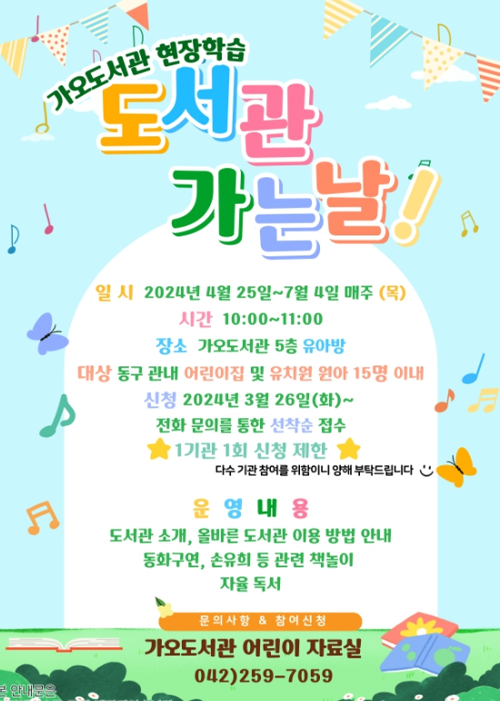 기타 자세한 사항은 동구공공도서관 누리집 공지사항을 참조하거나 가오도서관 어린이 자료실로 문의하면 된다.
