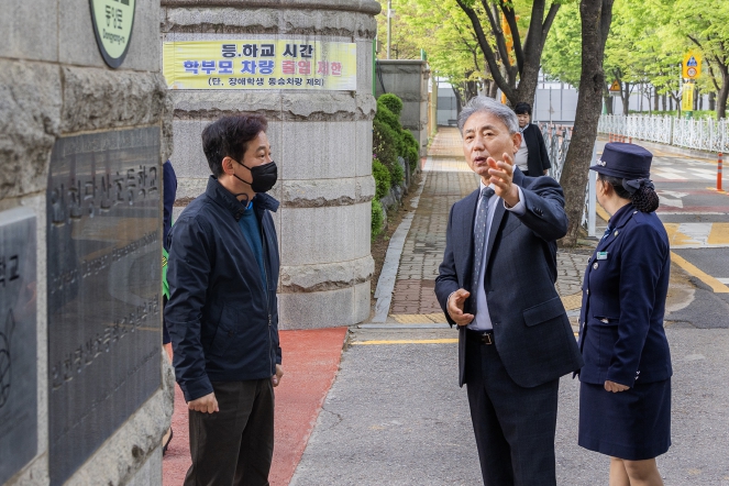 또한, 윤환 구청장과 관계자들은 학교 주변 도로와 통학로를 꼼꼼히 살피며 교통안전 위험 요소와 시설물 등 환경을 점검했다.
