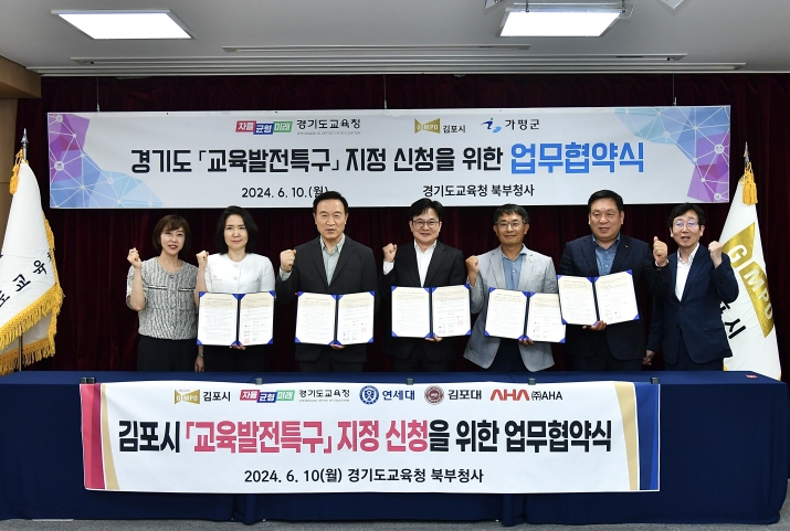 | ▲ 교육발전특구 시범사업 운영 업무협약 후 기념사진. 좌로부터 서혜정 경기도교육청 정책기획담당관, 박진영 김포대 총장, 임태희 경기도교육감, 김병수 김포시장, 이남규 연세대 산학교육분과장, 구기도 아하대표, 이창우 김포시교육지원과장 |