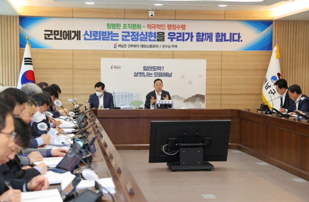 해남군은 민선8기 적극적으로 일하는 공직사회 조성을 위해 연초 실행계획을 수립하고 부서별 장기 미해결과제 및 규제 해소 등 주민 체감도가 높은 현안 중심으로 중점 과제를 발굴해 적극행정을 추진하고 있다.