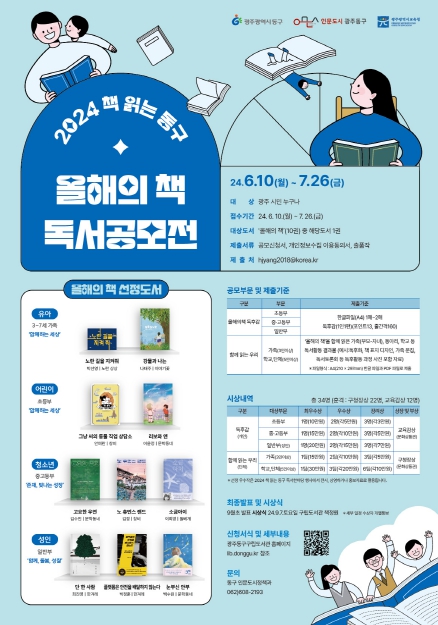 [뉴스서울] 광주 동구는 오는 7월 26일까지 책 읽는 문화 확산과 독서 의욕을 높이기 위한 2024 책 읽는 동구 ‘올해의 책’ 독서공모전을 개최한다고 밝혔다.