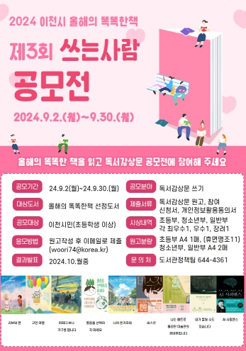 [뉴스서울] 이천시 도서관은 이천시민들에게 독서와 글쓰기를 통해 문해력을 높이고 인문학적 소양을 높일 수 있는 기회를 제공하고자 ‘2024 올해의 똑똑한 책’을 읽고 독후감 쓰기 대회인 ‘제3회 쓰는 사람 공모전’을 개최한다. 앞서 이천시 도서관은 ‘2024 올해의 똑똑한 책’으로 이천시민의 추천과 이천시민의 투표로 총 9권(아동3, 청소년3, 일반3)의 책을 선정한 바 있다.