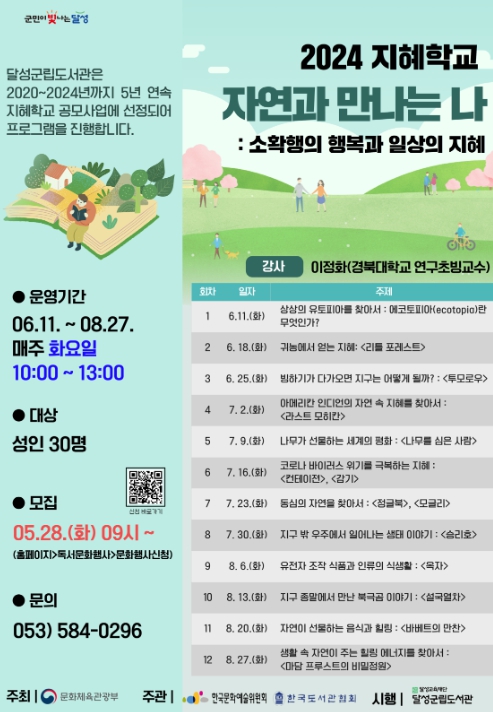 ‘2024년 길 위의 인문학’은 ‘유네스코 세계유산과 달성 MBTI’라는 주제로, 달성을 중심으로 산(M : mountain)·책(B : book)·문화적 전통(T : tradition)·미래를 여는 영감(I : inspiration)이라는 주제 아래 인근 지역 도서관인 고령군 다산도서관과의 협업으로 강연과 탐방을 구성하여 프로그램을 진행한다. 또, ‘2024년 지혜학교’는 ‘자연과 만나는 나 : 소확행의 행복과 일상의 지혜’라는 주제로 이정화 교수(경북대학교 연구초빙교수)와 함께 6월부터 8월까지 12주간 진행한다.