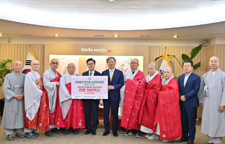 이날 김 지사는 한국불교 태고종 사회복지재단으로부터 720만 원 상당의 라면 500상자를 기탁받았다.