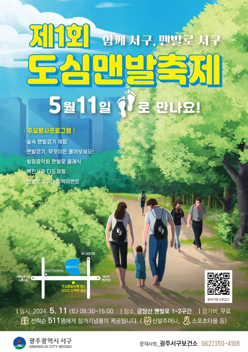 [뉴스서울] 맨발걷기 붐 조성에 앞장서고 있는 광주광역시 서구가 호남권 최초로 도심맨발축제를 선보인다. 서구는 오는 11일 풍암동 금당산에 조성된 맨발로(路) 4.1㎞ 구간에서 시민 누구나 참여하고 즐기는 맨발축제를 개최한다고 밝혔다.