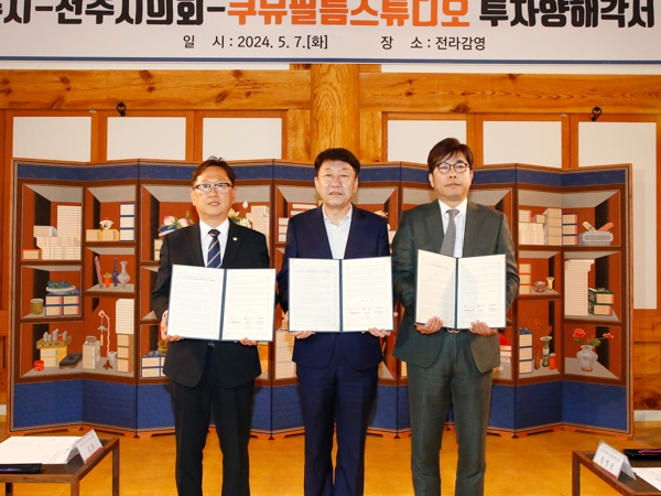 이날 체결된 투자 양해각서는 △쿠뮤필름스튜디오 제2 스튜디오 전주 건립 △조명·무대의상·소품·인테리어·엑스트라 공급 등 관련 기업 유치 △전주 영화·영상 등 콘텐츠기업 투자 활성화 등을 위해 상호 협력하는 내용을 골자로 하고 있다.