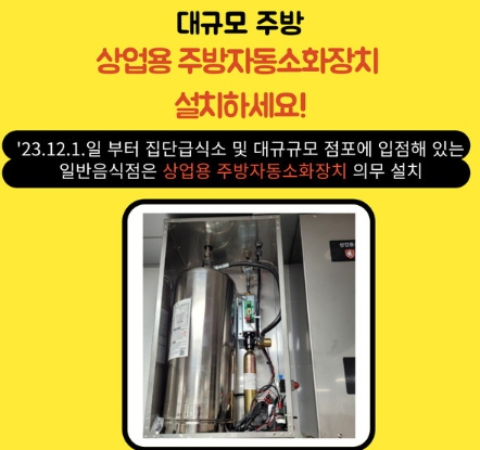 지난 해 개정된 소방시설법(약칭)에 따라 2023년 12월 1일 이후 신규로 영업을 시작하는 집단급식소와 대규모 점포에 입점하는 일반 음식점의 주방에는 상업용 주방자동소화장치를 의무적으로 설치해야 한다.