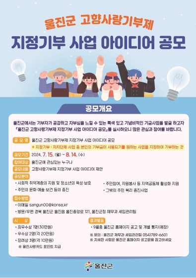 [뉴스서울] 울진군은 기부자가 공감하고 자부심을 느낄 수 있는 특색 있고 기념비적인 기금사업 발굴을 위해 7월 15일부터 8월 14일까지‘고향사랑기부제 지정기부 사업 아이디어 공모’를 실시한다.