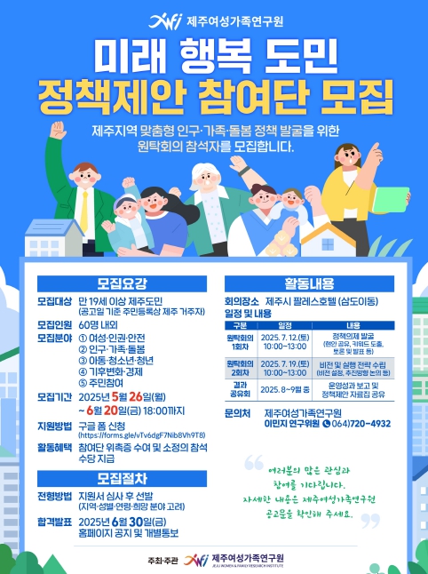 [뉴스서울] 제주여성가족연구원은 도민이 직접 정책을 제안하고 논의하는 '미래 행복 도민 정책제안 참여단'을 모집한다고 밝혔다.