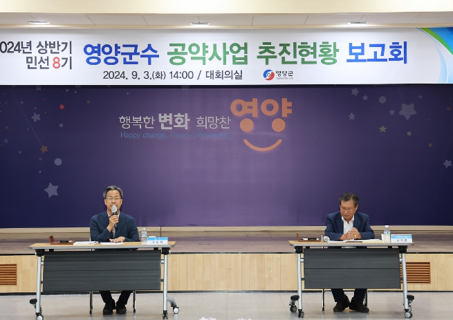 지난 9월 3일 영양군청 대회의실에서 공약이행 평가위원 11명 외 70여명이 참석한 가운데, '24년 상반기 영양군수 공약사업 추진현황보고회를 열고 민선 8기 2년간의 공약 이행 현황을 점검했다.