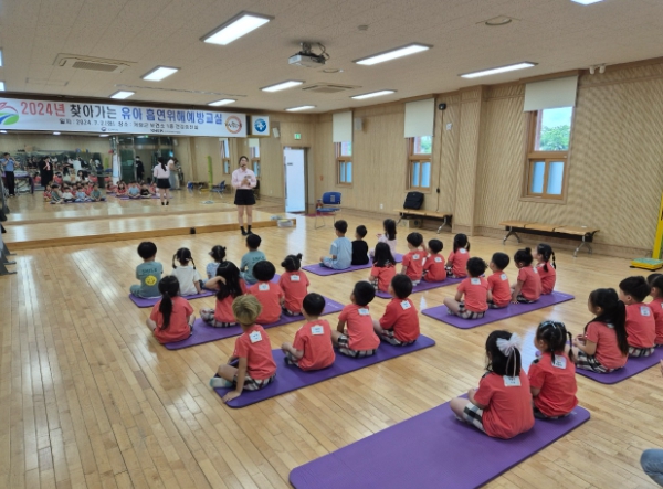 2024년 찾아가는 유아 흡연 위해예방교실은 보건복지부와 한국건강증진개발원이 시군구 보건소와 연계하여 추진하는 사업으로, 교육을 신청한 어린이집 11개소, 유치원 2개소 중 최종적으로 어린이집 5개소, 유치원 1개소를 선정해 총 166명의 유아들에게 교육을 실시했다.