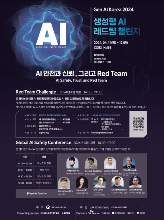 행사 1일차에 개최되는 ‘레드팀 챌린지’는 네이버클라우드‧SKT‧업스테이지‧포티투마루 등 국내를 대표하는 AI 기업의 모델을 대상으로 1,000명의참가자가 잠재적 위험‧취약점을 식별하는 공개 챌린지 방식으로 진행된다.