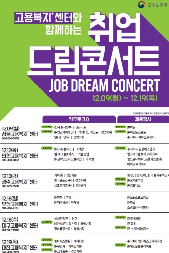 고용노동부는 집중 취업‧채용지원 기간 동안 민간 주요 채용플랫폼 사람인‧잡코리아와 같이 서울‧부산‧대전 등 6개 권역별로 “2025 취업드림 콘서트”를 개최하여 취업전략특강과 직무토크쇼, 일자리 수요데이* 채용행사를 함께 제공한다.