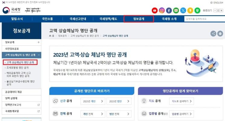 ▲ 고액・상습체납자 신규 명단 공개(국세청 누리집) |