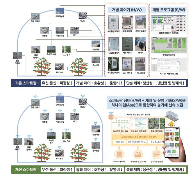 연구진은 장비 간 호환성 문제를 해결하기 위해 기존 유선 방식의 데이터 통신을 유무선 방식으로 확장하고, 표준 데이터 코드와 사물인터넷 표준 통신 규칙을 활용해 ❶‘스마트팜 장비 통합관리 기술 지침’을 만들었다. 또한, 빅데이터, 인공지능 등 다양한 기술을 접목한 응용 서비스를 하나의 앱(App)으로 구현할 수 있도록 앱 실행 프로그램과 이를 설치, 갱신할 수 있는 ❷‘농업용 앱스토어’를 개발했다.