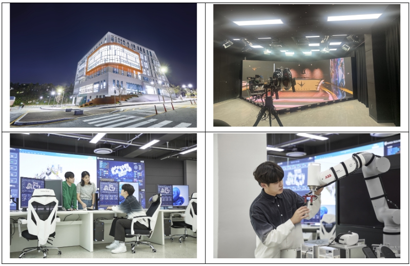 ▲ (상단 왼쪽부터) 한국기술교육대 다담 미래학습관 전경, XR스튜디오, 스마트러닝팩토리 관제센터에서 학생들이 실습하는 장면 |