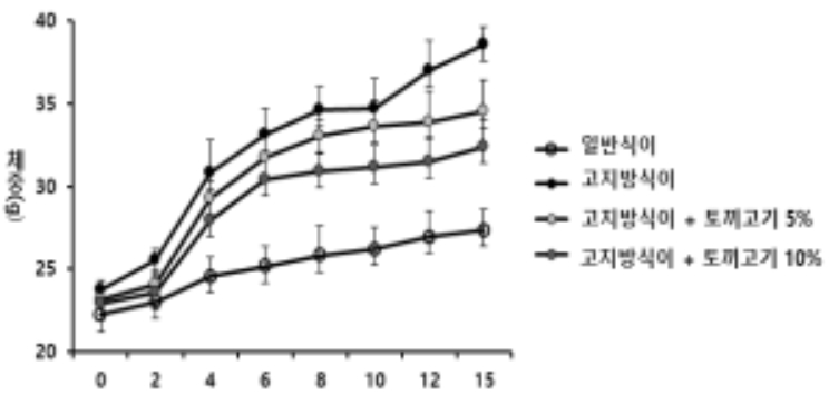 연구 결과, 토끼고기를 포함한 고지방 식이군이 토끼고기를 포함하지 않은 단순 고지방 식이군에 비해 체중 증가가 유의미하게 억제된 것이 확인됐다. 실험 초기(0주)에는 모든 실험군의 체중이 유사한 수준이었으나, 토끼고기를 포함한 고지방 식이군의 체중 증가가 점진적으로 억제됐다. 특히 토끼고기를 10% 포함한 식이군이 5%를 포함한 식이군보다 체중 증가가 더욱 둔화했다.