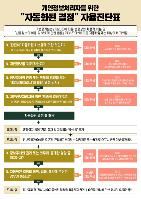 인공지능(AI) 기술 등을 활용하여 자동화된 시스템으로 의사결정을 하고 있는 기업ㆍ기관 등은 “자동화된 결정 자율진단표”를 활용하여 스스로 자동화된 결정에 해당하는지 여부를 확인해 볼 수 있다.