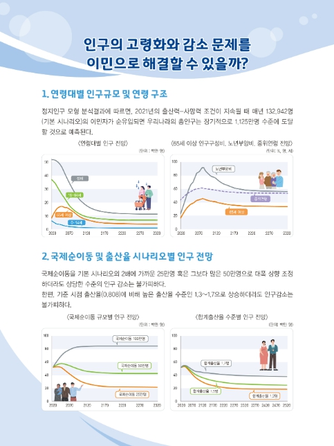 ▲ 인구의 고령화와 감소 문제를 이민으로 해결할 수 있을까?(한국보건사회연구원 연구보고서 「이민의 인구학적 파급 효과와 정책 과제」(2023년)의 일부분을 발췌·재구성) |