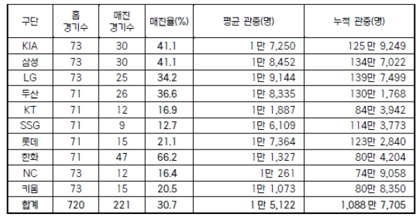 정규시즌 1,2위를 차지한 KIA와 삼성도 엄청난 열기로 30번의 매진으로 이어지며 41.1% 매진율을 기록했다. 두산이 26회, LG가 25회 매진으로 총 5개 구단이 25회 이상, 30% 이상의 매진 경기를 만들어냈다. 뒤이어 롯데, 키움 15회, KT, NC 12회, SSG 9회 매진을 기록했다.