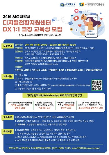 교육 대상은 경기도 소상공인 및 예비 창업자 중 디지털 배움터 역량 수준 진단 기본, 중급, 고급 단계 해당자로 오는 19일까지 서정대 홈페이지 내 대학 공지 사항을 통해 신청서를 받은 후 이메일로 접수하면 된다.