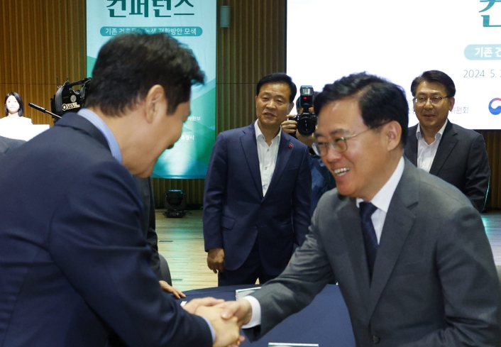 ▲ 진교훈 서울 강서구청장(오른쪽)이 2일(목) 오전 서울시청 8층 다목적홀에서 열린 ‘기후위기 대응을 위한 녹색건물 컨퍼런스’에 참석해 오세훈 서울시장과 악수하고 있다. |