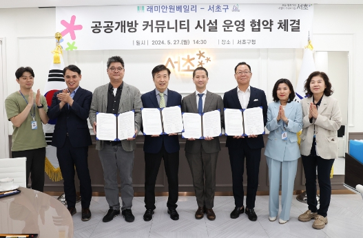 서울 서초구는 지난 27일 래미안원베일리 공공개방 커뮤니티 시설 개방을 위한 서초구-래미안원베일리 입주자대표회의-신반포3차·경남아파트 주택재건축정비사업조합-한솔아이키움 간 협약을 체결했다.
