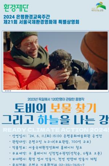 이번 특별상영회는 6월 5일 환경의 날을 맞아 추진됐다. 영화를 통해 환경 감수성을 깨우고 기후 문제 해결에 많은 구민이 동참하길 바라며 마련됐다. 상영회에서는 2023년 독일에서 120만 명 이상이 관람한 ‘토비의 보물 찾기, 그리고 하늘을 나는 강’이 상영된다.
