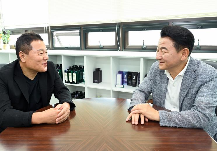 김동근 시장은 기업 대표를 만나 브랜딩 등 기업운영에 관한 이야기를 나누고, 지역경제 활성화와 일자리 창출에 큰 역할을 하는 제이숲에 감사와 격려의 뜻을 전했다.