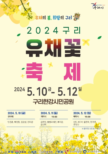 [뉴스서울] 구리시는 5월 가정의 달을 맞아 5월 10일부터 12일까지 3일간 구리한강시민공원에서 온 가족이 함께 즐길 수 있는 ‘2024 구리 유채꽃 축제’를 개최한다.