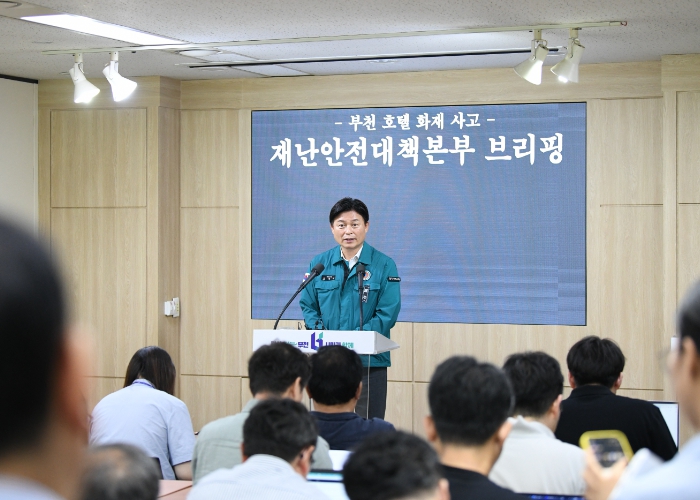[뉴스서울] 조용익 부천시장이 23일 시청 브리핑룸에서 ‘부천 중동 호텔 화재 사고’ 관련 브리핑을 열고, 화재 사고 수습과 피해자 지원에 총력을 다하겠다고 밝혔다.