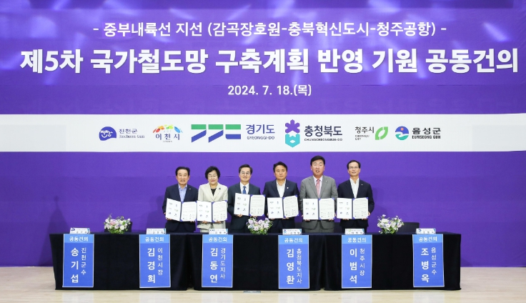 [뉴스서울] 6개 도・시・군 단체장은 18일 음성군청에 모여 중부내륙철도 지선 제5차 국가철도망 구축계획 반영 공동협력을 위한 공동건의문에 서명했다.
