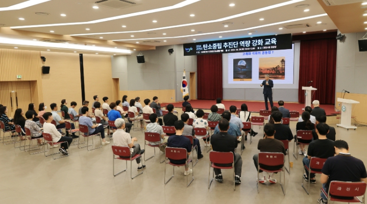 29일 시청 대강당에서 열린 이날 교육에서는 박광석 전 기상청장이 ‘기후위기 시대 지자체 탄소중립 역할’을 주제로 지자체 차원의 기후위기 대응 전략과 부문별 감축 정책 사례 등에 대해 강의했다.