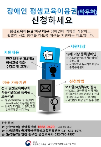 신청일 기준으로 인천 중구에 주소지를 두고 있는 19세 이상 등록장애인이면 신청할 수 있다. 기초생활수급자와 차상위계층을 우선 선정하고, 1인당 연간 35만 원(최대 21명)의 장애인 평생교육 이용권을 지원한다.