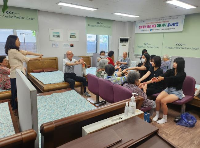 실버·조이 평생학습단 회원들은 조선이공대학교에서 치매 예방과 실버 뷰티 케어 이론·실기 과정을 학생들과 함께 수강하고 있으며 지역사회에 공헌하고자 이번 재능기부 봉사활동을 진행하게 됐다.