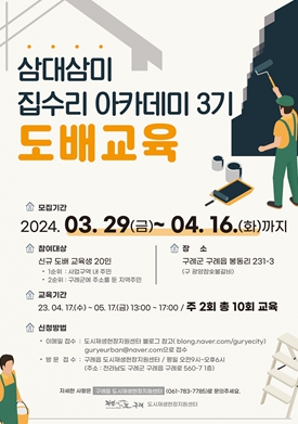 [뉴스서울] 전남 구례군은 4월 16일까지 구례읍 도시재생현장지원센터에서 2024 삼대삼미 집수리 아카데미 3기 도배 교육 수강생을 모집한다고 밝혔다.