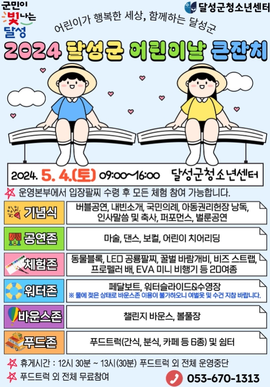 누구나 참여 가능한 ‘2024년 달성군 어린이날 큰잔치’는 푸드존을 제외한 모든 것에 무료로 참여 가능하며, 군은 이날이 행사명에 걸맞은 어린이들을 위한 큰잔치가 될 수 있도록 행사 막바지 준비에 힘쓰고 있다.