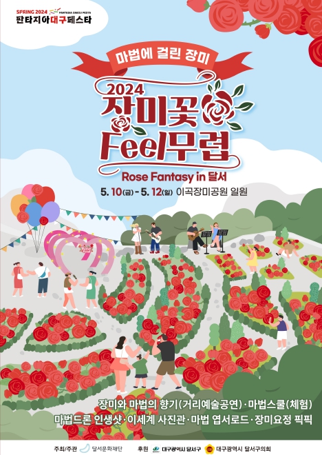 [뉴스서울] 가정의 달인 5월을 더욱 아름답게 꾸밀'2024 장미꽃 필(Feel) 무렵'이 오는 10일부터 12일까지 달서구 이곡장미공원에서 3일간 개최된다.'장미꽃 필(Feel) 무렵'은 지난해 ‘판타지 인 달서’ 라는 주제를 이어 올해는 시즌 두 번째, ‘판타지 인 달서, 마법에 걸린 장미’라는 주제로 대구시민들과 축제관람객들을 만난다.