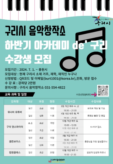 [뉴스서울] 구리시는 오는 8월부터 구리시 음악창작소에서 구리 시민의 잠재적 예술인 양성을 위한 ‘2024 하반기 아카데미 de’구리’를 시작한다.