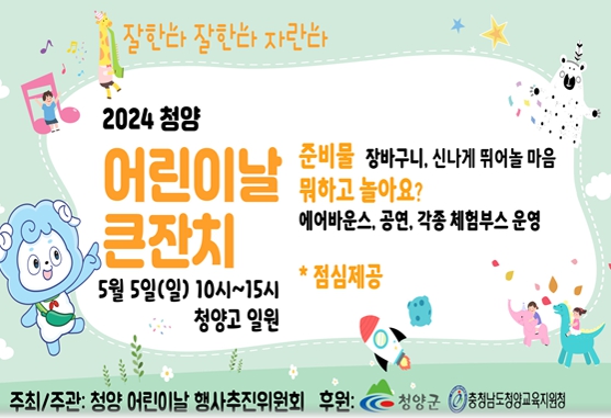 이번 행사는 청양군이 후원하고 청양어린이날행사추진위원회가 주관해 내일의 주역으로 자라날 어린이들에게 꿈과 희망을 심어주고자 어린이는 물론 가족이 함께 참여하고 즐기는 잔치의 한마당으로 꾸며진다.
