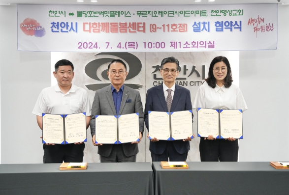 이번 협약에 따라 불당호반써밋플레이스·천안푸르지오레이크사이드아파트와 천안명성교회는 천안시에 다함께돌봄센터 설치를 위한 공간을 10년간 무상 제공하고, 천안시는 리모델링과 기자재구입비를 지원한다.