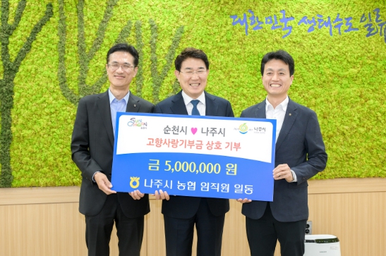 주철호 농협순천시지부장과 신경훈 농협나주시지부장은 “이번 상호기부를 통해 고향사랑기부제가 더욱 활성화되고, 농업․농촌 상생 효과와 더불어 지역 발전에 도움이 되기를 바란다”고 전했다.
