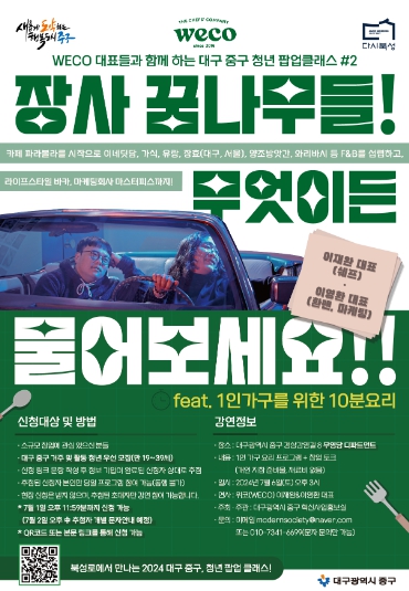 무영당에서 두 번째로 열리는 클래스는 중구 삼덕동에 기반을 두고 있는 청년 창업 요식 브랜드 위코(WECO)의 공동대표 2인(이재완, 이영환)을 초청해, 1인 청년가구를 위한 요리 체험 프로그램과 함께 창업 토크 콘서트 형식으로 진행된다.