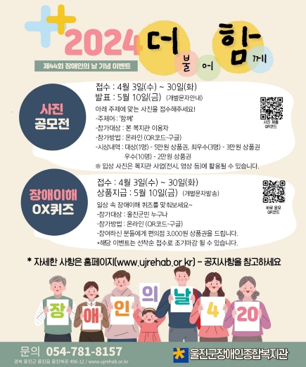 손정일 울진군장애인종합복지관정운“이번 사진 공모전과 장애이해 OX퀴즈를 통해 장애인과 비장애인의 이해와 소통을 돕는 기회가 되길 바란다”라며“앞으로도 울진군장애인종합복지관은 군과 협조하여 장애에 대한 사회인식을 개선하길 위해 노력하겠다”고 말했다.